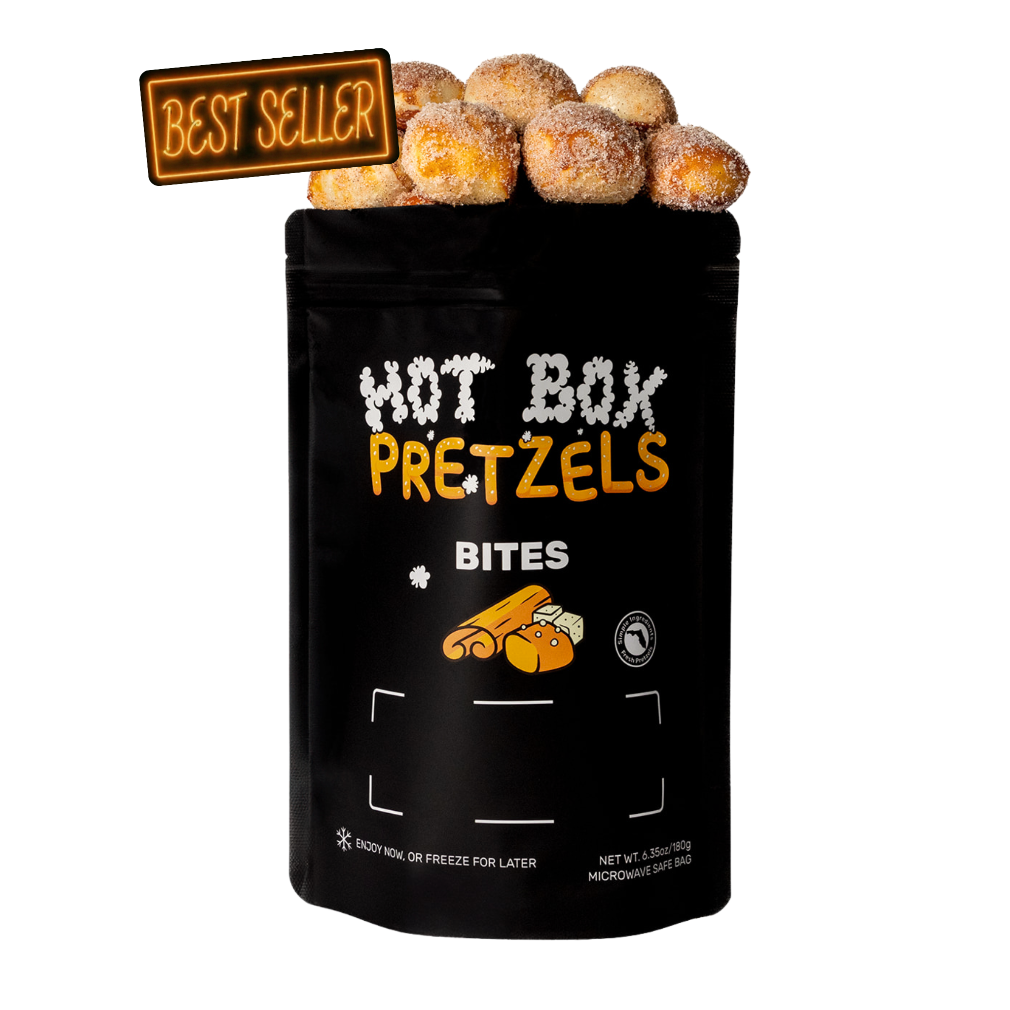 For those who love a simple, buttery, and perfectly sweet snack, the Cinnamon is the perfect choice. Each pack includes about 14 fluffy, buttery pretzel bites per bag. Each bag comes with a cinnamon packet —no extra seasoning needed, just pure pretzel perfection.