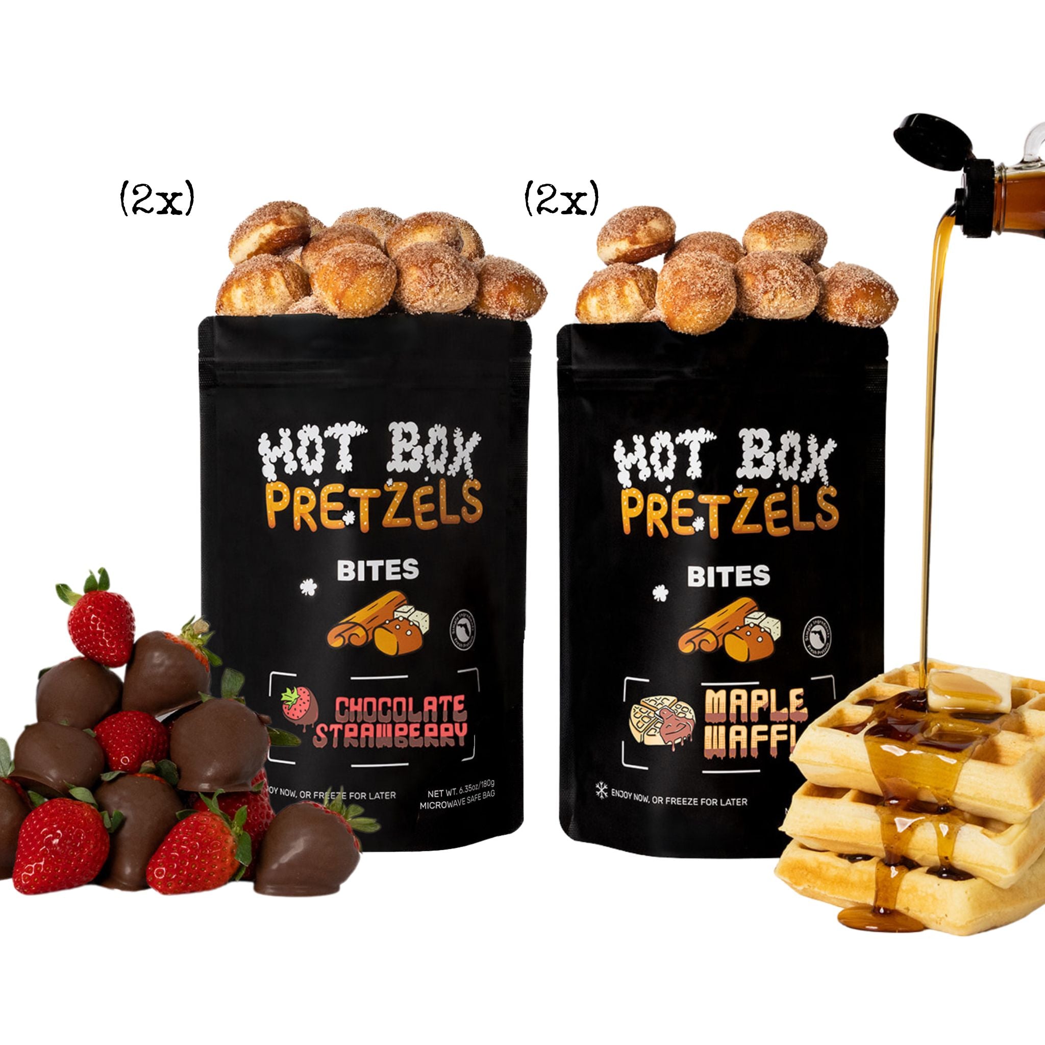 For those who love warm, soft, and sweet flavors, the Sweet Squad Pack is the perfect treat. Each pack includes 4 bags, with 14 soft, flavorful pretzel bites per bag. Each bag comes with a cinnamon packet and a seasoning packet in either Maple Waffle or Chocolate Strawberry, with two of each flavor for double the sweetness.